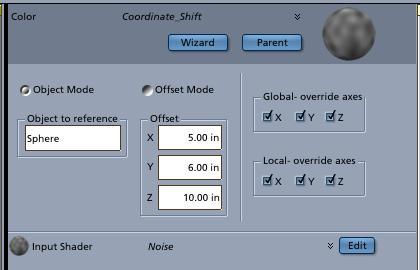 In Object Mode, the hotpoint coordinates of the object named in the Object to reference box are subtracted from the coordinates of the point being shaded