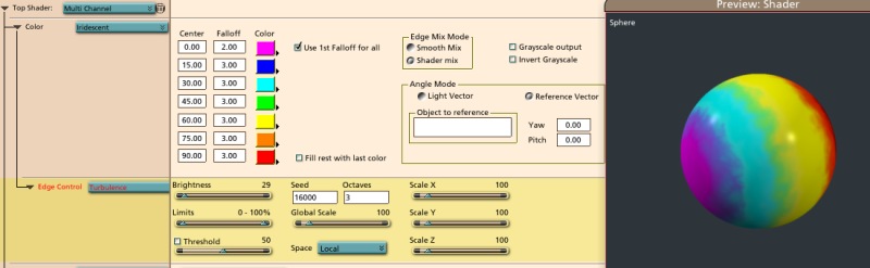 Shader mix uses values from the Edge Control shader to add some control to how the bands are blended. Turbulence and Noise type shaders are good for adding a little randomness.