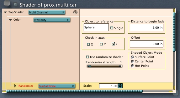 If this box is checked, the first object in the scene that exactly matches Object to reference will be used for the distance calculations. If it is NOT checked, ANY object in the scene whose beginning matches the Object to reference will influence the proximity shader. For example, if the Object to reference is Sphere, and single is not checked, Sphere 1, Sphere w34234 and Spheretacular will all be included in the distance calculation. Whichever object is closest will determine the value.