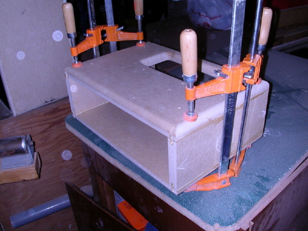 Amp cabinet getting glued up. You can se the cutout to access the controls.