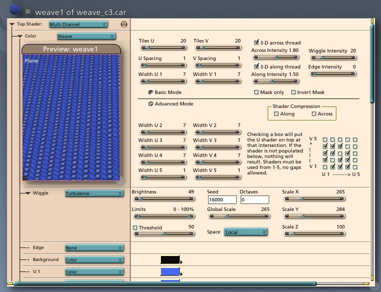 Basic Mode is a quick way to do a simple weave. It uses U1 and V1 only. None of the other shaders or widths are used. The On top checkbox matrix is also overridden. (If you haven’t figured it out yet, those are all of the controls below the line. ;-) Adanced mode enables all controls.
