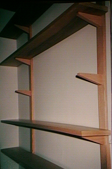 Book Shelves The criteria for these book shelves was that they be inexpensive (competitive with metal shelf standards), quick to build, easy to install. Uprights and standards are oak. A single 1/2" dowel pins each standard to the upright. A piece of 60 grit sandpaper is contact cemented to the flat of the standard to prevent the shelves from slipping off. (Not recommended for California) The shelves are birch plywood with iron-on veneer edging on all visible edges.