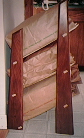 The Recycle Rack This is one of the first things I built. When our town instituted curbside recycling, we started out with three paper bags on the floor in the kitchen. Effective, but not very attractive. The bag concept worked, but I wanted more organization, a smaller footprint, and a better appearance. Thus was born this rack. Wedged through mortise and tenon, half lap joints. 3/4 poplar, stained brown on the uprights, water based poly over all.