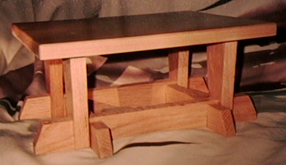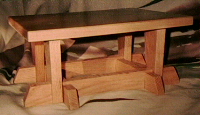 Boot Changing Bench Our home has a narrow front hallway which we partially floored with slate. The bench was born out of the inconvenience of sitting on the floor to change between inside and outside footwear. I found some two inch thick oak, but it wasn't quite wide enough, so I laminated in some maple. I designed the support structure to have an Oriental feel- and to have enough space above the stretcher to hold the "inside" shoes. There are many subtle angles in the support structure, which intimidated me into letting the project languish for some time. What I finally ended up doing was ignoring all the calculated angles and just building to by eye and feel-- no plan. I was surprised and pleased with how well it went together. Blind mortise and tenons, halflaps. Oak and maple, Tung oil finish.