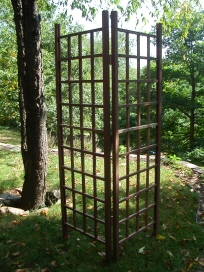 Portable Pavilion My wife needed a booth to do her massage therapy from. Rather than buy something, I figured I could make one pretty easily- epsecially if I bought a pneumatic brad nailer! Any project where you get to buy a new tool is a good project!! This is one of four identical corners that are tied together with long rails around the top. The grills in the middle are half lap joints, glued and nailed, and then fit into grooves in the uprights Built from decking mahogany, unfinished. Click the image for more pictures.