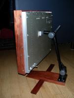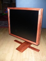 LCD Monitor My company used to build LCD monitors, but we’re out of that business now. I picked up a panel, the asociated electronics, and a bunch of mounting arm samples when we cleaned up. As it turns out, I never change the height or angle, so I could have made a fixed base. The wood is an exotic- I picked up a single small piece while buying some other wood from a dealer. This project pretty much used it up, but I think is was a good fit. The computer is in the living room, so appearences are important. The backplate is from an old plotter.