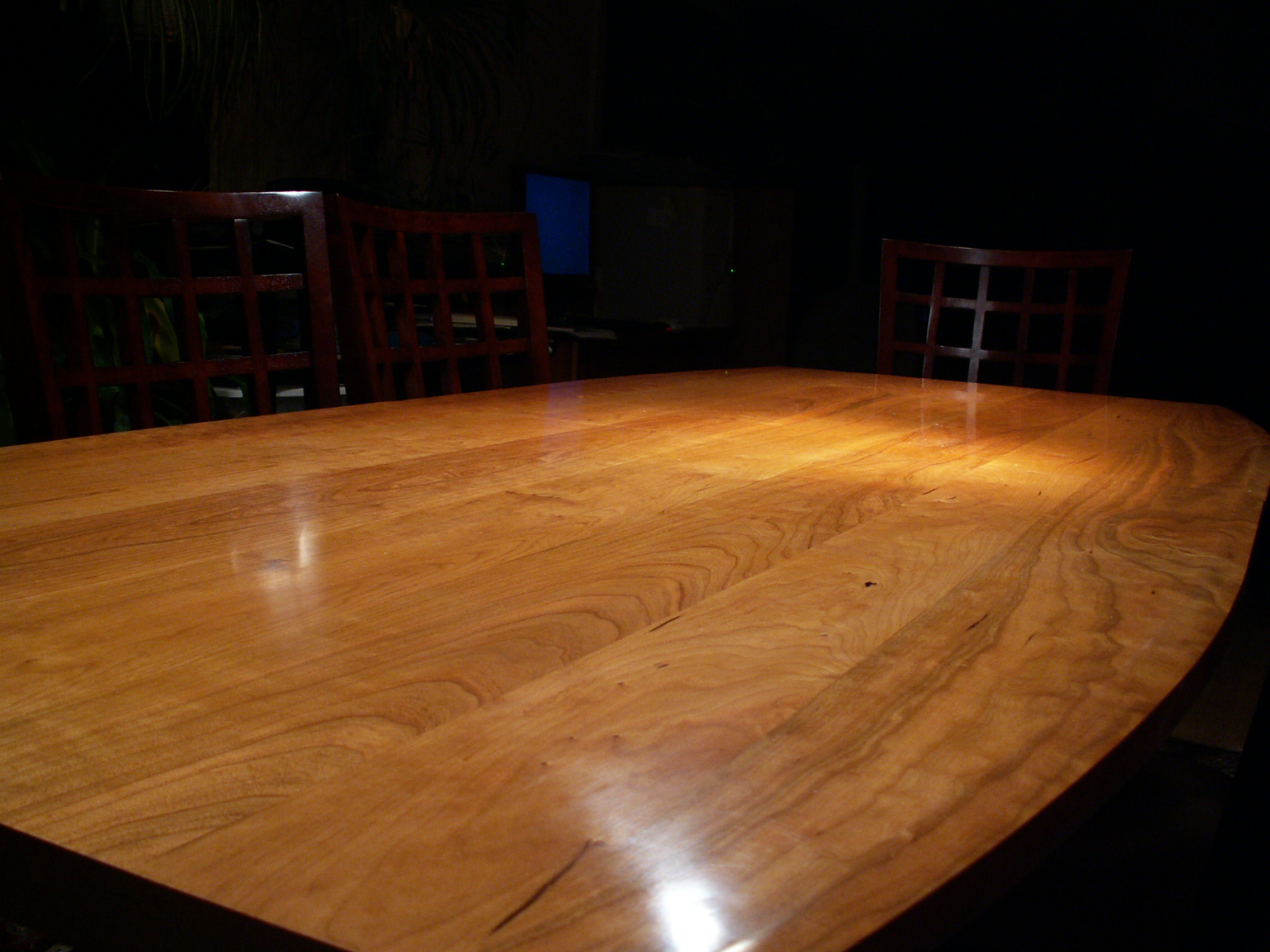 Dining Room Table Long story, but basically, we bought a dining set with 6 chairs and a table with a damaged table top. On purpose. ;-) I ordered a glue-up of 6/4 cherry from New England Hardwood- 80” x 38”. Larger than the original, and as big as we can fit in our smallish dining room. There will be a leaf too, another 18” or so. Lots of sanding, lots of finishing, lots of rubbing out the finish with pumice and parafin oil. About 2 1/2 months, with a week of vacation and a week of travel thrown in. The full photo gallery is here. I think it was worth it.