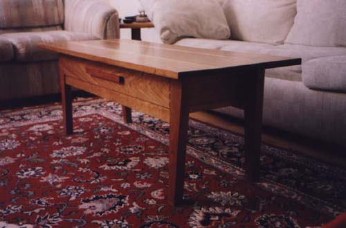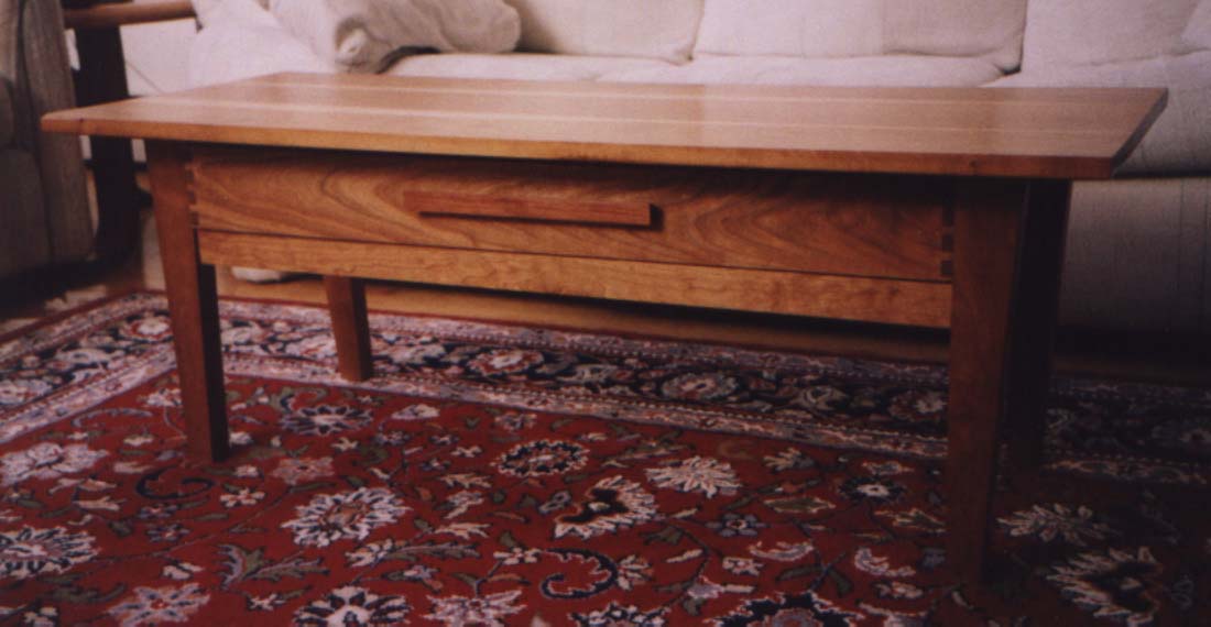 Cherry Coffee Table This was built as a wedding present for my best friend. The construction is very similar to the boot changing bench above- the legs are mortised into a thick top, and then a framework is built to the legs. The drawer slides in either direction to allow access from both sides. Solid cherry throughout, except for the drawer pull which is purpleheart. Tung oil and oil based poly finish. Click thumbnail for more pictures.