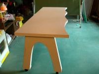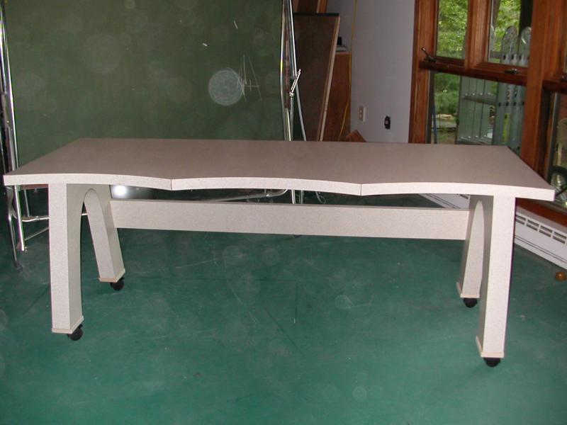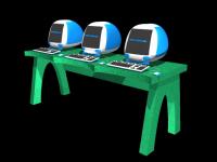 Computer Table, 2nd Grade Classroom When I visited my sons classroom, I saw that they had three computers that were placed on two desks that were tie-wrapped together, with the middle user straddling the tied legs. I offered to build them a new table. The dimensions were fixed by the location in the room, and it was a facilities requirement that all new furniture be on wheels to facilitate cleaning. I tried to make a design that would create three separate spaces in the limited length of the table. I also made it a knock-down design. The legs unbolt from stubs on the tabletop, and the cross brace unscrews.This was the first time that I crossed over my 3D hobby with my wood working hobby- it allowed me to play with the proportions and curves until I was happy with the overall effect. Constructed from multiple layers of plywood. Finished with formica.Click the thumbnails for more pictures.