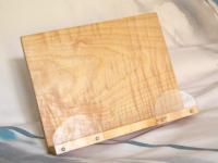 Cookbook Stand This is the second incarnation of a basic cookbook stand. I built the original several years ago- it was put together with screws into endgrain, and didn't collapse for storage. Eventually it simply collapsed permanently. This model addresses the size issue- the leg folds into a groove in the back to allow for easier storage. Overall the construction and design is pretty clean. Curly maple, Plexiglas. Tung oil. Click thumbnails for more pictures.