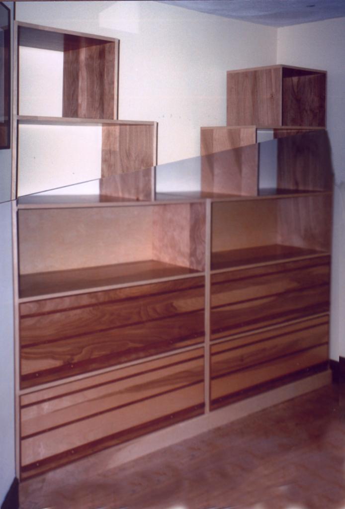 Tansu Style Cabinets Another wedding present- inspired by the step-style tansu cabinets of Japan. Designed to hold oversize books and games. The two cabinets are mirror images- they can be set this way, with an inner step, or swapped to create an outer step. Each cabinet has two flipper doors on the bottom two shelves. Birch plywood, birch edging. Mahogany detailing on the doors, maple kick board. Water based poly finish. The picture is assembled from two snap shots taken in a small room- sorry!
